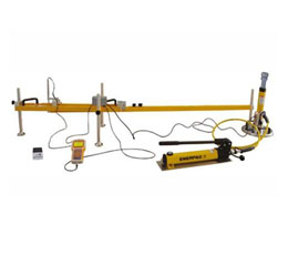 3.安置承載板及千斤頂 將承載板放置于測試點(diǎn)上,使承載板與地面完全接觸,必要時(shí)可鋪設(shè)一薄層干燥砂(2~3mm)或石膏膩?zhàn)樱瑫r(shí)利用承載板上水準(zhǔn)泡或水準(zhǔn)儀來調(diào)整承載板水平。 將反力裝置承載部位安置于承載板上方,并加以制動。承載板外側(cè)邊緣與反力裝置支撐點(diǎn)之間的距離不得小于0.75m。將千斤頂放在承載板的中心位置,使千斤頂保持垂直。用加長桿和調(diào)節(jié)絲桿使千斤頂頂端球鉸座與反力裝置承載部位緊貼。